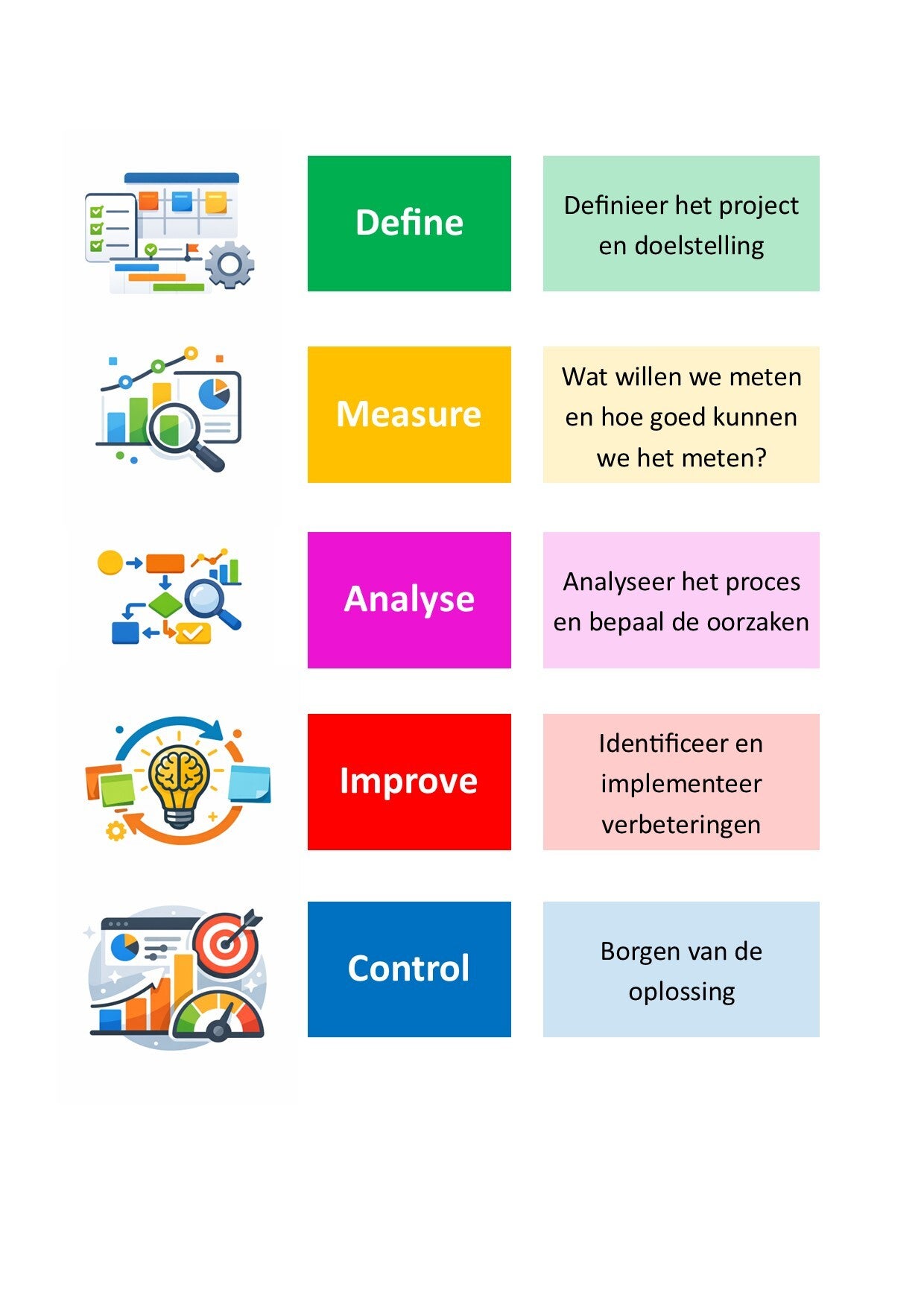 Een verbeterproject kan goed worden gemanaged via de vijf fasen van een lean six sigma aanpak. De klantwensen zijn altijd het startpunt voor een project. Is dit niet helder dan kan een customer journey inzicht geven. Het is de kunst deze voice of the customer (VOC) te vertalen naar klanteisen ten aanzien van de dienstverlening. Dit zijn de zogenaamde Critical To Quality (CTQ's). Denk bijvoorbeeld aan een kortere levertijd of minder klachten door verbeterde kwaliteit van het product. Daarnaast is er ook oog voor de Voice Of the Business (VOB). Hoe kan bijvoorbeeld herbewerking worden voorkomen, zodat het product of dienst gelijk goed kan worden afgeleverd, maar ook de verbetering van een verkooproces. Het doel is het verhogen van de klanttevredenheid en een verlaging van de kosten. Er is geen beter marketinginstrument dan tevreden klanten. Het zijn kleine verbeterprojecten waar steeds een paar doelen tegelijk worden opgepakt in een relatief korte periode. In het project wordt aan de hand van data gemeten, wat de huidige prestatie is op de relevante onderdelen en wordt gekeken waar de oorzaken liggen van de te lage performance. Vervolgens is de improve fase het moment om verbeteringen te bedenken en te implementeren. Afhankelijk van de omgeving kan de verbetering klein zijn door een applicatieonderdeel te veranderen of groot door een heel nieuw proces te ontwerpen. Een businesscase kan antwoord geven op de haalbaarheidsvraag. In deze fase kan design thinking helpen. Er zijn talloze technieken die kunnen helpen om de creativiteit te bevorderen en de juiste keuze te maken voor het doorvoeren van de verbeteringen. Bijna alle processen worden ondersteund door automatisering. Van de offerteaanvraag via de website tot de facturering. Veel organisaties kennen een landschap vol met applicaties die met elkaar zijn verbonden. Vaak zijn daar veel verbetermogelijkheden te vinden of kunnen juist handmatige bewerkingen worden geautomatiseerd. Het proces blijft natuurlijk wel de basis. Naast procesoptimalisatie is vaak ook een digitale transformatie nodig als kleine verbeterstapjes in de applicaties niet meer mogelijk zijn, doordat de systemen zijn verouderd of niet meer aansluiten bij het gewenste proces. Het is een iteratief proces waarbij in de volgende project weer een aantal verbeterslagen worden doorgevoerd vanuit weer een nieuwe definefase. In onderstaand schema is de Lean Six Sigma aanpak weergegeven.